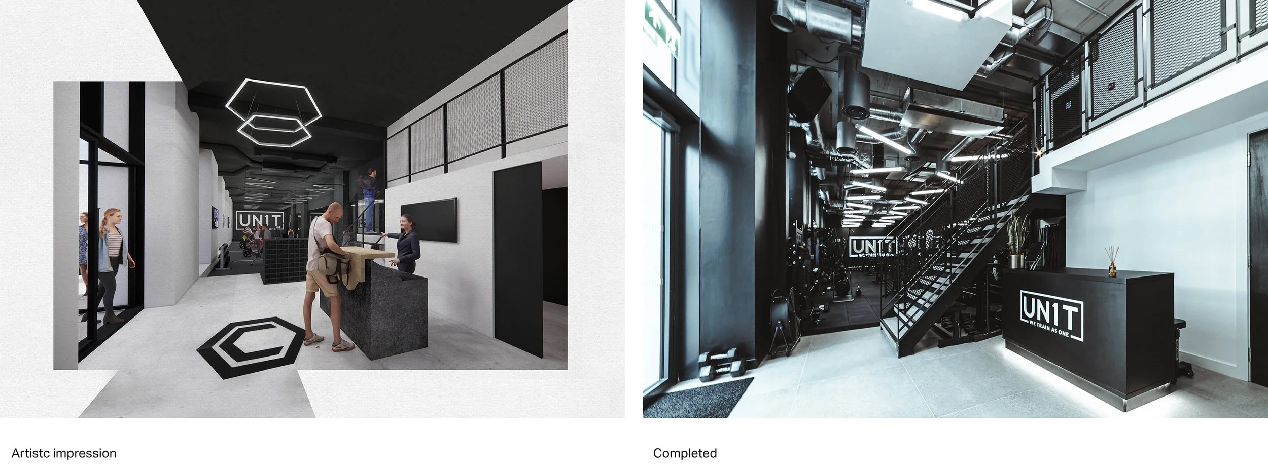 The studio's open-plan layout embodies the spirit of togetherness, fostering a sense of camaraderie among participants who share a common goal - to excel as part of the UN1T community. With soaring 4+ meter-high ceilings and expansive full-height windows, natural light floods the space, creating an invigorating atmosphere. Exposed ducts, echoing the ruggedness of UN1T workouts, punctuate the space, infusing it with authenticity and raw energy.